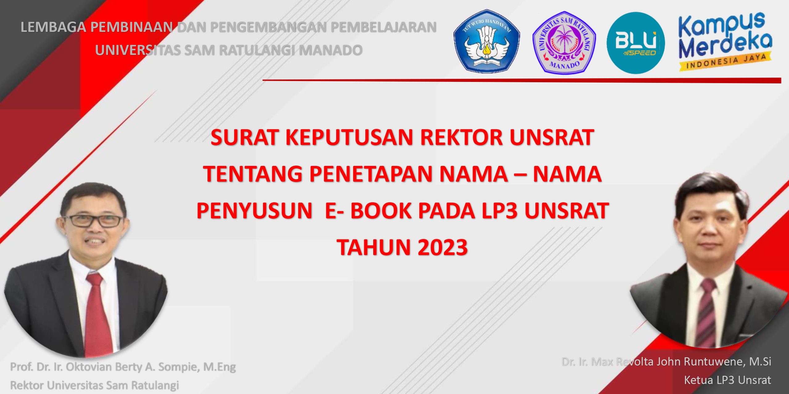 Post navigation KEGIATAN RAPAT KERJA LP3 UNSRAT DAN PENANDATANGANAN KONTRAK KINERJA TAHUN 2023 SURAT KEPUTUSAN REKTOR UNSRAT TENTANG PENETAPAN NAMA – NAMA PENYUSUN BUKU AJAR PADA LP3 UNSRAT TAHUN 2023